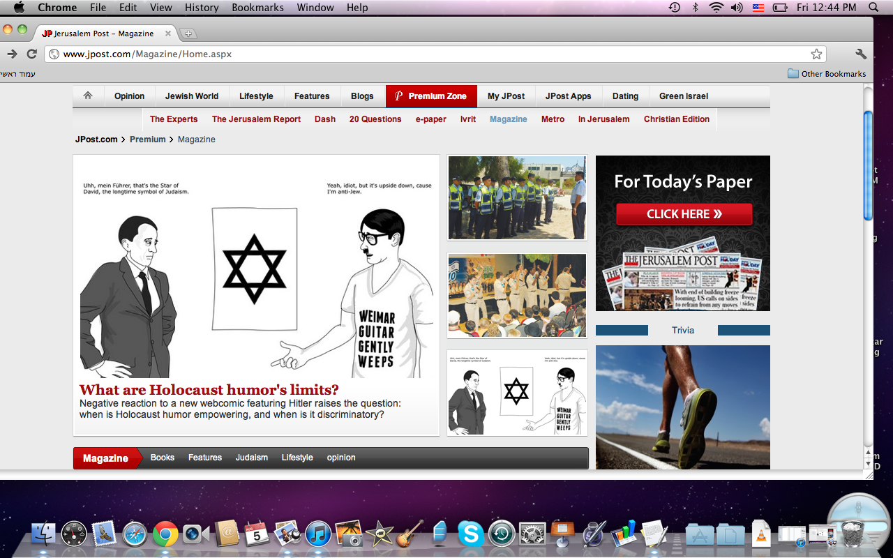 As some of you may know, I am in the midst of writing an article about a webcomic called “Hipster Hitler.” The premise is that Hitler is portrayed as a modern day Hipster. I’m curious if the Jewish community thinks this comic is funny. More generally, I’m also curious what folks think is on/off limits in regards to Holocaust humor.